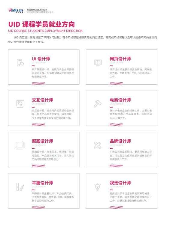 課程簡(jiǎn)介:達(dá)內(nèi)教育集團(tuán)在2012年推出UID課程,培養(yǎng)了兼具平面設(shè)計(jì)、網(wǎng)頁(yè)界面設(shè)計(jì)、Web前端設(shè)計(jì)、智能設(shè)備界面設(shè)計(jì)的全鏈路UI設(shè)計(jì)師。