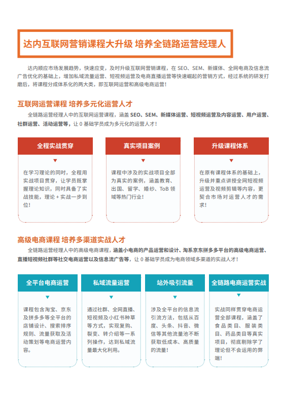 適合學(xué)員:應(yīng)屆畢業(yè)生、在職轉(zhuǎn)行、在職提升 使用教材:線下授課 授課時(shí)間:周末業(yè)余班、全日制脫產(chǎn)班 課程簡介:達(dá)內(nèi)順應(yīng)市場發(fā)展趨勢,快速應(yīng)變,及時(shí)升級互聯(lián)網(wǎng)營銷課程,在SEO、SEM、新媒體、全網(wǎng)電商及信息流廣告優(yōu)化的基礎(chǔ)上,增加私域流量運(yùn)營、短視頻運(yùn)營及電商直播運(yùn)營等快速崛起的營銷方式,經(jīng)過系統(tǒng)的研發(fā)打磨后,將課程分成體系化的兩大類,即互聯(lián)網(wǎng)運(yùn)營和高級電商運(yùn)營! 課程特色: 1.全程實(shí)戰(zhàn)貫穿 2.真實(shí)項(xiàng)目案例 3.升級課程體系 |