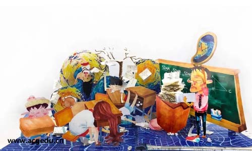 A:我的這本立體書的靈感來自于繁重的中式教育。這本書的尺寸還是挺大的。在做之前,我和老師先把書的構思記錄下來并進行構圖。在選擇材料的時候,經過和老師的討論,我最終以蠟筆為主,馬克筆為輔,同時使用了過去初中時寫的卷子來完成了這個作品。由于是立體書,我還思考過怎樣才能讓所有的角色和物品立起來,所以感覺就是一個好的項目都需要一份精細的plan吧。還有就是要嘗試不同的材料,因為有些材料創(chuàng)造出來的效果也許會超乎你的想象:)