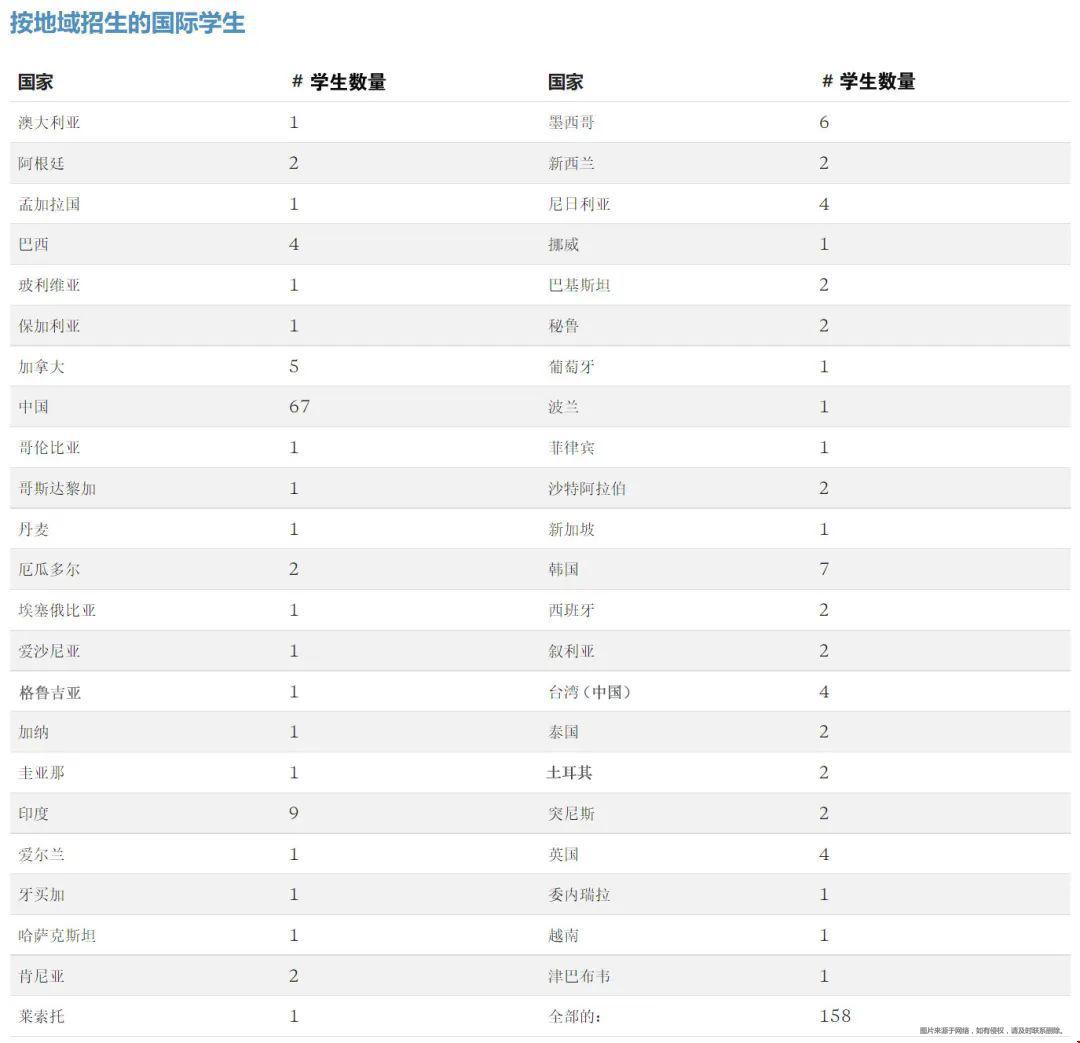 2021秋季入學(xué)的國(guó)際學(xué)生共計(jì)有158人,其中中國(guó)大陸學(xué)生67人,中國(guó)臺(tái)灣4人。中國(guó)大陸學(xué)生在國(guó)際學(xué)生中的比例為42.4%