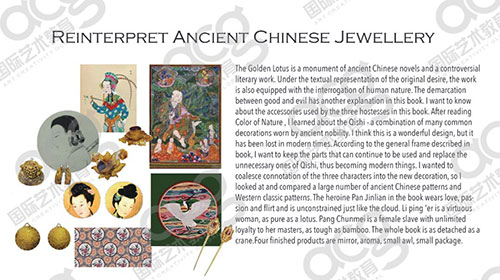 在作品集中我們需要展現(xiàn)的是我們的思維邏輯性。我們的設計靈感是怎么來的,如Z同學她重新定義了中國古代的珠寶,從調研中不難發(fā)現(xiàn)搜尋了很多古代珠寶的圖片作為靈感參考。