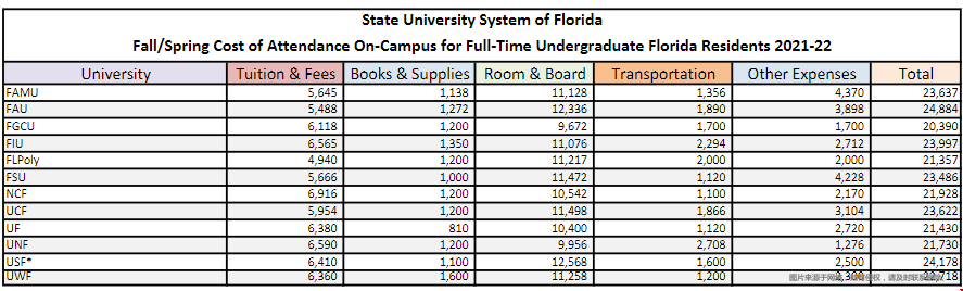 所在系統(tǒng)各個大學(xué)學(xué)費:FAMU:5,645美元;FAU:5,488美元;FGCU:6,118美元;FIU:6,565美元;FLPoly:4,940美元;FSU:5,666美元;NCF:6,916美元;UCF:5,954美元;UF:6,380美元;UNF:6,590美元;USF:6,410美元;UWF:6,360美元