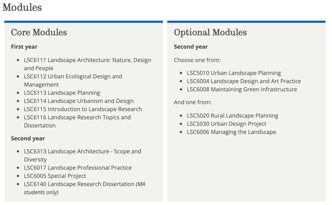 1年制的landscape studies課程需申請人有景觀相關的本科學位,不受Landscape Institute認證。但它和兩年制課程第一年所學內(nèi)容幾乎一致,成績優(yōu)秀者完成了該年的學習,可申請繼續(xù)就讀第二年的課程,從而拿到兩年制的學位。