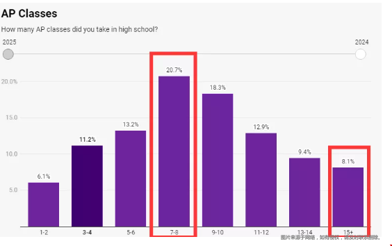 接下來就是大家重點關(guān)注的學(xué)術(shù)背景!申請美國常春藤的學(xué)生幾乎人人必考AP,但是你相信么?8%的入學(xué)新生(大約50人)考了15門以上!