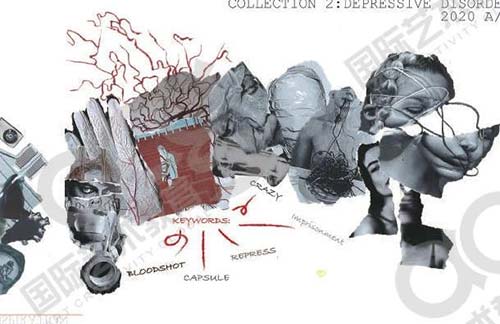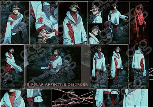 這個項目是想讓人們了解和接受現(xiàn)實生活中的痛苦,在面料和印花的選擇上面來表現(xiàn)主題,比如天鵝絨比鹿皮便宜一些,但是質(zhì)感差不多,是一種很高檔的感覺,硬挺,體現(xiàn)出一種壓力,不放松的感覺,大面積的用了這種材質(zhì)。還有紅色的緊實毛衣,是一種很緊實、束縛的感覺,魚尾半裙,上面是紅血絲刺繡,整體就是想體現(xiàn)服飾的質(zhì)感,高檔的感覺。