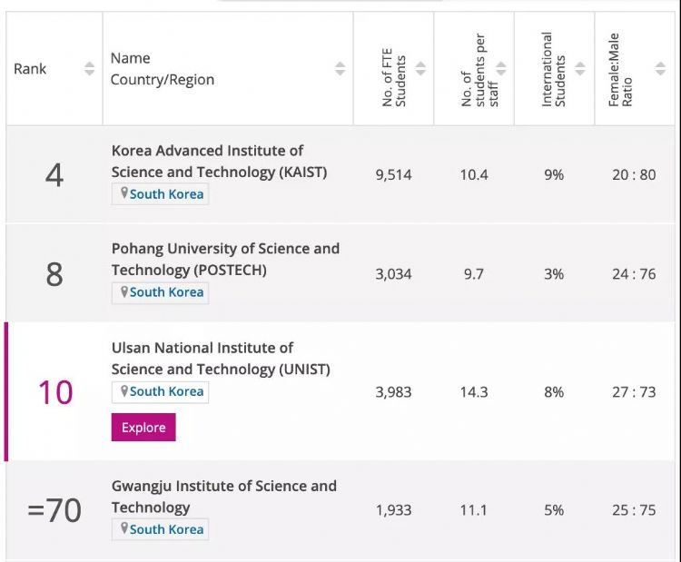 韓國科學(xué)技術(shù)院(第4名)和蔚山國家科學(xué)技術(shù)研究所(第10名)兩所韓國年輕院校表現(xiàn)不錯(cuò)。
