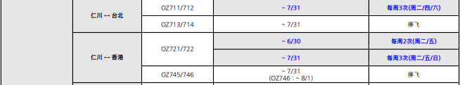 根據(jù)韓亞航空公布的最新航班信息來(lái)看,7月份韓亞航空僅保留了仁川-長(zhǎng)春的OZ303/304航班,仁川-香港的OZ721/722航班以及仁川-臺(tái)北的QZ711/712航班。