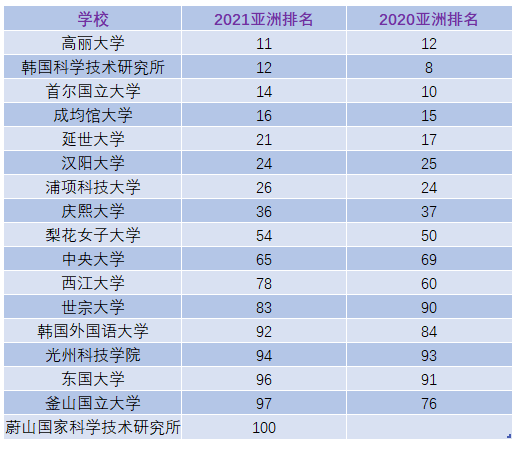 韓國(guó)共有88所大學(xué)上榜,進(jìn)入榜單前100的有17所,具體榜單如下: