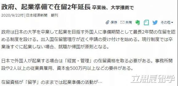 據(jù)《日本經濟新聞》報道,為了給在日外國留學生創(chuàng)造創(chuàng)業(yè)的條件,日本政府將設立一項簽證新制度,賦予從日本各地的大學畢業(yè)后希望留下創(chuàng)業(yè)的外國留學生最長可滯留2年的簽證。