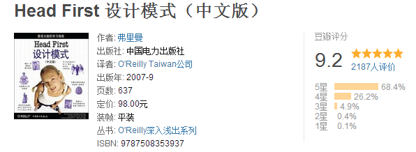 在看完《HeadFirst Java》之后,另一本HeadFirst系列的書《HeadFirst設(shè)計(jì)模式》也是可以嘗試閱讀的。《HeadFirst設(shè)計(jì)模式》簡(jiǎn)單有趣、而且通俗易懂,它不會(huì)有很復(fù)雜的概念在里面。這本書可以讓讀者快速掌握概念、培養(yǎng)興趣?!禜eadFirst Java》作為一本設(shè)計(jì)模式的入門學(xué)習(xí)書籍,是非常適合初學(xué)者的。