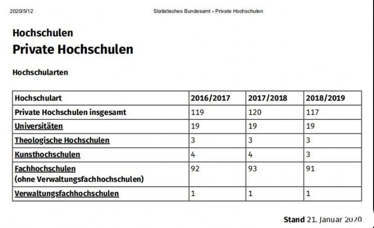 在聯(lián)邦數(shù)據(jù)局的統(tǒng)計(jì)中可以看出,在2018/2019學(xué)年,德國(guó)共有117所私立高校,其中有19所綜合性大學(xué)、91所應(yīng)用科技大學(xué)和3所藝術(shù)音樂(lè)院校。其他還有3所私立的神學(xué)院和一所行政學(xué)院。