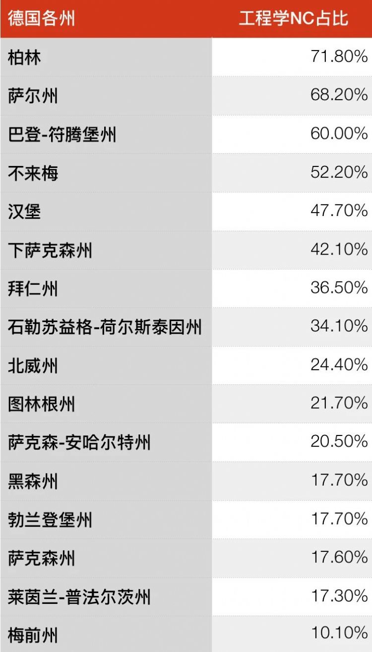 最高的NC占比是柏林,達(dá)到66.1%,而最低的圖林根州的NC專業(yè)占比僅有19.4%,整整差了3倍還多!