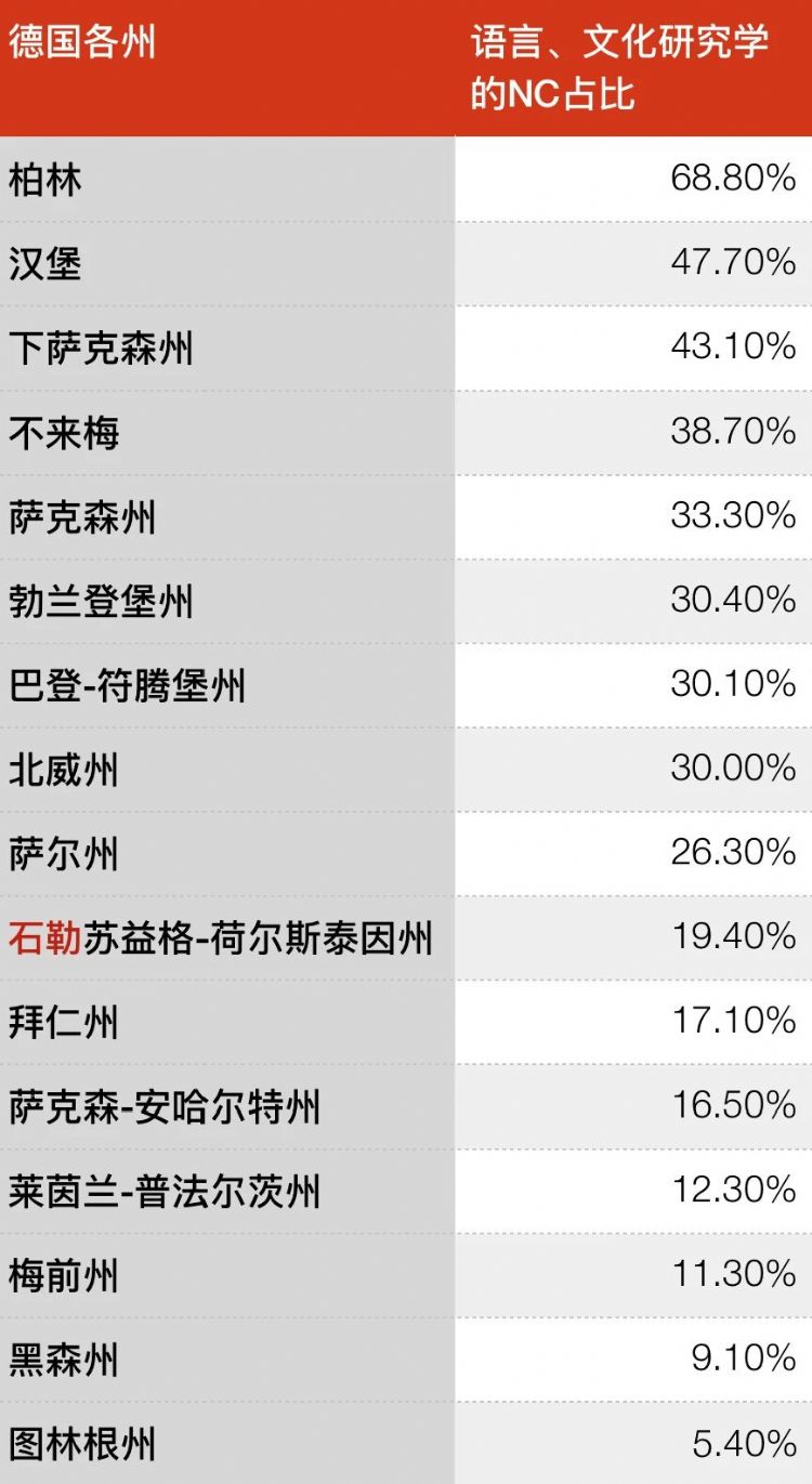 如上圖所示,在語(yǔ)言、文化研究學(xué)領(lǐng)域,柏林地區(qū)的NC占比最高,達(dá)到68.8%,其次就是漢堡、下薩克森地區(qū)的NC占比也高于40%。