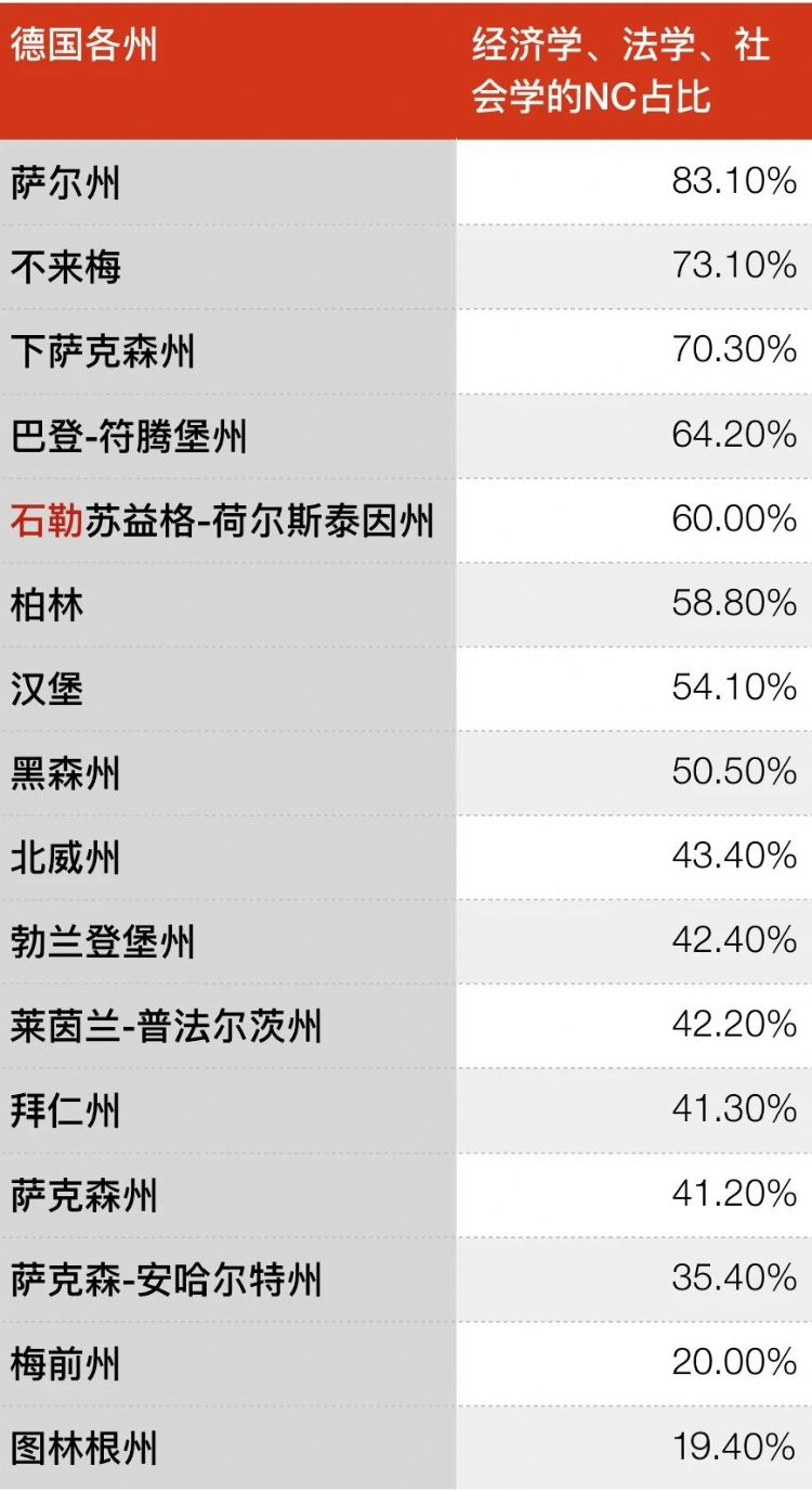 而像石荷州、拜仁州、薩克森-安哈爾特州、萊茵蘭-普法爾茨州、梅前州、黑森州、圖林根州的NC占比均低于20%。