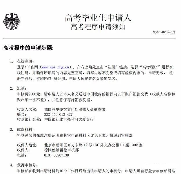 高考畢業(yè)生申請人 高考程序申請須知 電子郵件:info@aps.org.cn 網(wǎng)址:www.aps.org.cn 德國使館文化處留德人員審核部 地址: 北京市朝陽區(qū)東方東路 19 號 DRC 外交辦公大樓 D1 座 13 層 1302/03 室 [100600]