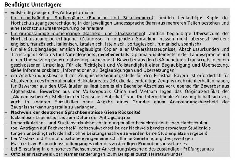 慕尼黑大學本科專業(yè)申請材料清單