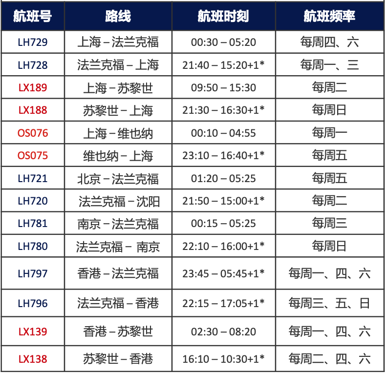 漢莎航空集團(tuán)大中華區(qū)航班時(shí)刻表