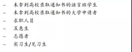 沒有拿到大學(xué)錄取通知書去讀語(yǔ)言的學(xué)生、沒有錄取通知書的申請(qǐng)人、互惠生、求職人員志愿者、實(shí)習(xí)生。