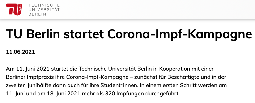 柏林工業(yè)大學(xué)官網(wǎng)顯示,6月下旬,學(xué)校就已經(jīng)與柏林疫苗接種機構(gòu)合作,開展針對學(xué)生接種疫苗的服務(wù)了。僅在 6 月份,柏林工業(yè)大學(xué)就為其教職工和學(xué)生安排了 1,800 多次接種。
