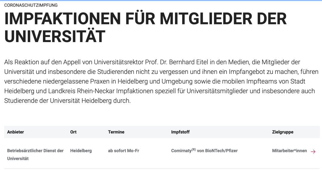 海德堡大學(xué)的學(xué)生也可以在校內(nèi)接種疫苗了!學(xué)生或教職員工只需要在巴登符騰堡州的網(wǎng)站 www.impfen-bw.de 上進行預(yù)約注冊,就可以在學(xué)校內(nèi)的醫(yī)療機構(gòu)接種疫苗了。