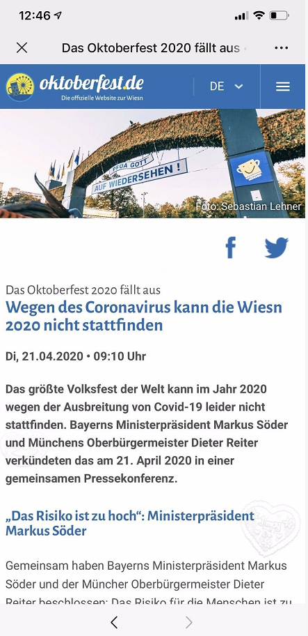 慕尼黑啤酒節(jié)官網(wǎng)消息,由于疫情影響,今年的慕尼黑啤酒節(jié)也宣布被取消了!