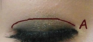 第三步:接著涂眼影,深啡色混合上一點(diǎn)黑色眼影,由下往上暈染在A區(qū)域。
