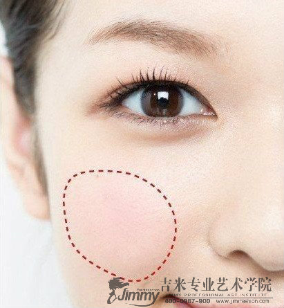 以瞳孔的垂直線和方鼻翼的水平線交點為中心,輕輕的刷上腮紅,若是較長的臉型,可以稍稍像眉尾處延伸。