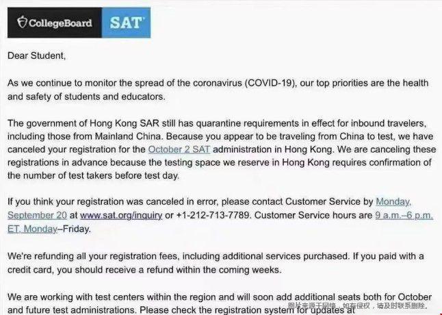 因?yàn)橐咔樵?,香港入關(guān)限制,大陸考生無(wú)法赴港考試,香港SAT考試承辦方香港考試評(píng)核局為了提前確定考試人數(shù),取消了大陸考生的考試安排。