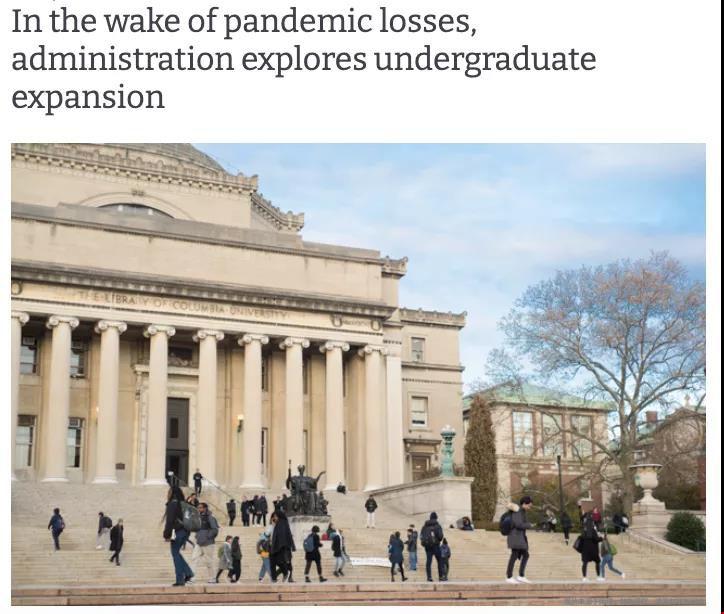 哥倫比亞大學(xué)文理學(xué)院院長Amy Hungerford在今年春季向?qū)W校高層提議,通過擴(kuò)招本科生和研究生來應(yīng)對疫情爆發(fā)以來哥倫比亞大學(xué)面臨的巨大財政缺口以及偏低的錄取率造成的優(yōu)秀人才流失。哥倫比亞大學(xué)校報稱,校方未透露具體的擴(kuò)招數(shù)字,但是本科生擴(kuò)招預(yù)計在5%-20%的水平。