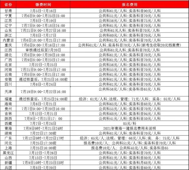 往年一級建造師各省報名費用如下:>>點擊查看一建報名費最新消息