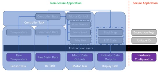 在上一篇文章中,我們探討了如何將一個(gè)系統(tǒng)分解成域和任務(wù),我們已經(jīng)確定了該系統(tǒng)的數(shù)據(jù)資產(chǎn)。你可能還記得,我們創(chuàng)建的上一張圖將我們的應(yīng)用程序分為安全和非安全應(yīng)用程序域、硬件獨(dú)立和依賴域(由抽象層分隔),最后分為任務(wù)。我們的系統(tǒng)分解如圖1所示。