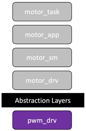Abstraction layer — 打破電機(jī)驅(qū)動(dòng)器和硬件之間的依賴關(guān)系。這允許我們使用PWM驅(qū)動(dòng)器來驅(qū)動(dòng)電機(jī),或者用外部集成電路的驅(qū)動(dòng)器來代替pwm_drv。