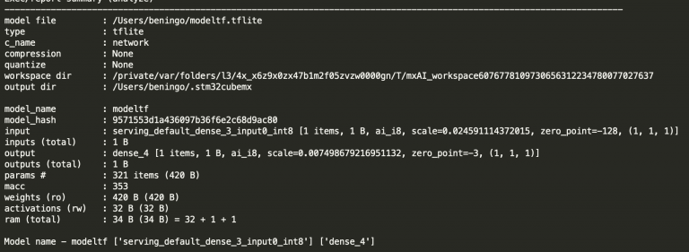 如你所見,摘要為我提供了用于該模型的內(nèi)存大小,例如權(quán)重和激活以及執(zhí)行機(jī)器學(xué)習(xí)模型所需的乘法和累加指令的數(shù)量。(這是一個(gè)超級簡單的模型,所以大小以字節(jié)為單位!對于現(xiàn)實(shí)世界的例子來說不是很現(xiàn)實(shí))。
