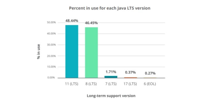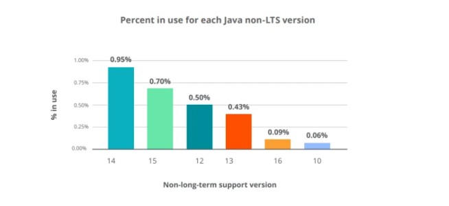 請(qǐng)注意,這些版本是長期支持的,最新的LTS版本Java 17尚未建立穩(wěn)固的地位,但在發(fā)布后的幾個(gè)月內(nèi)已經(jīng)超過了大多數(shù)非LTS版本。非LTS Java版本通常采用率較低,只有少數(shù)供應(yīng)商在其上提供補(bǔ)?。?/span>Azul Systems是支持某些非LTS版本的最聰明的代表)。如今,只有2.7%的應(yīng)用程序運(yùn)行在非LTS Java版本上,而Java 14是其中的王者,Java 10和Java 16最不受歡迎。