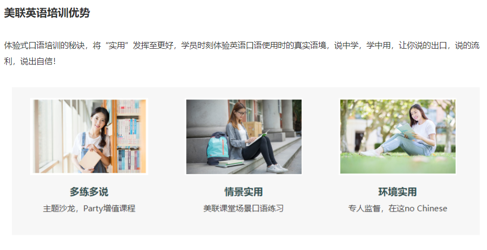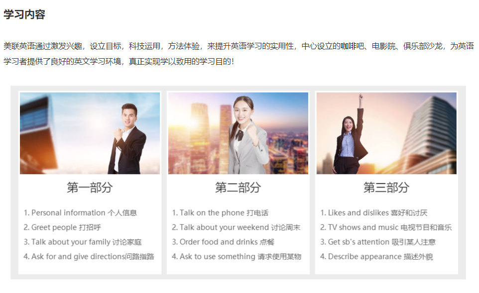 廣州美聯(lián)零基礎(chǔ)成人英語班為14周歲以上的人士開設(shè),側(cè)重對(duì)英語口語技能和語言準(zhǔn)確度的訓(xùn)練,以“做中學(xué)”為核心,在美聯(lián)您可以找回英語學(xué)習(xí)時(shí)的快樂,它在“體驗(yàn),娛樂,互動(dòng)”的基礎(chǔ)上,在模擬的英文環(huán)境中,為您提供學(xué)習(xí)和操練基礎(chǔ)英語的機(jī)會(huì)。