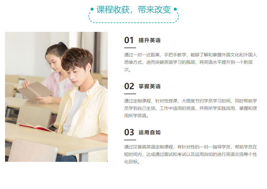 漢普森英語(yǔ)是中國(guó)一家“洋家教”個(gè)性化外語(yǔ)研究及教學(xué)機(jī)構(gòu),采用外教一對(duì)一的授課方式。 外教口語(yǔ)主要針對(duì)希望與英語(yǔ)為母語(yǔ)者進(jìn)行口語(yǔ)交流的學(xué)員,由來(lái)自英國(guó)、美國(guó)、澳洲等地區(qū)的專(zhuān)業(yè)外籍教師,小班授課,提供純正的語(yǔ)言環(huán)境,輕松愉悅的西式學(xué)習(xí)氛圍,大量形式多樣的課堂口語(yǔ)互動(dòng)環(huán)節(jié),使學(xué)員提高口語(yǔ)實(shí)戰(zhàn)運(yùn)用能力的同時(shí),習(xí)慣英語(yǔ)思維模式,了解西方文化。