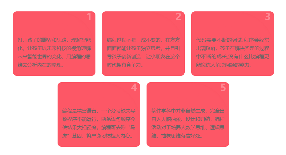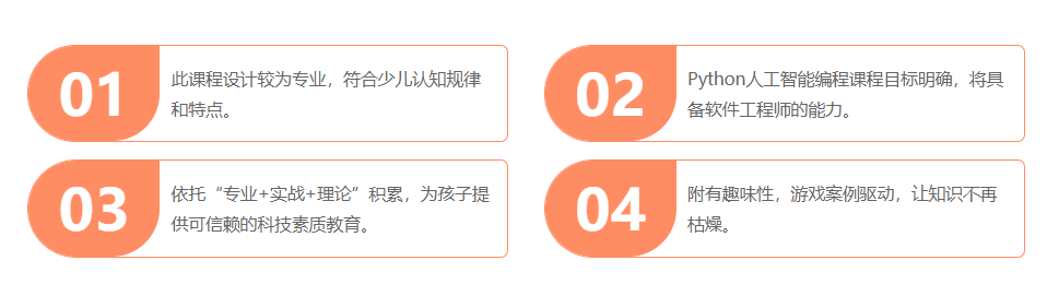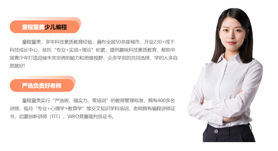 python人工智能編程,是以時下流行編程語言Python為主,依托多年科技素質(zhì)教育經(jīng)驗,研發(fā)的一套系統(tǒng)的少兒科技素質(zhì)教育體系,培養(yǎng)孩子的編程思維和綜合能力。童程童美Python人工智能編程課程融入數(shù)學(xué)、語文、英語、物理等知識,提升學(xué)員編程思維、數(shù)學(xué)思維、抽象思維、邏輯思維、批判思維、工程思維、專注能力、表達能力、嚴(yán)謹(jǐn)習(xí)慣、解決問題能力、設(shè)計能力、創(chuàng)新能力。