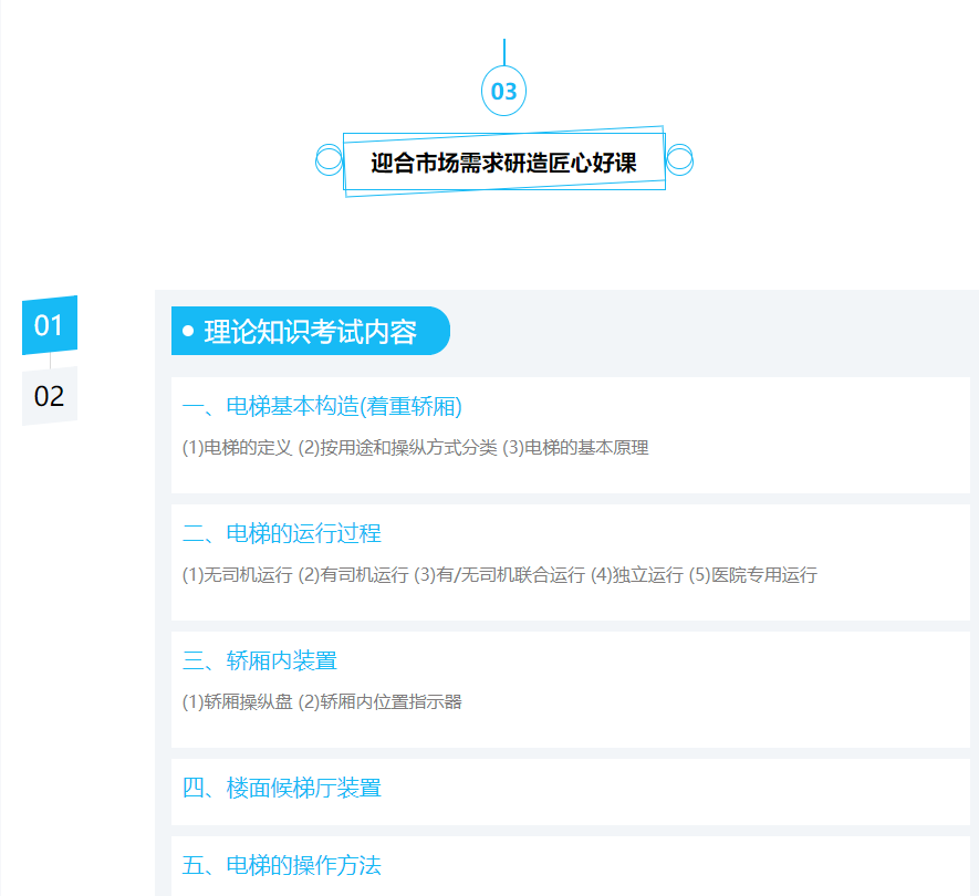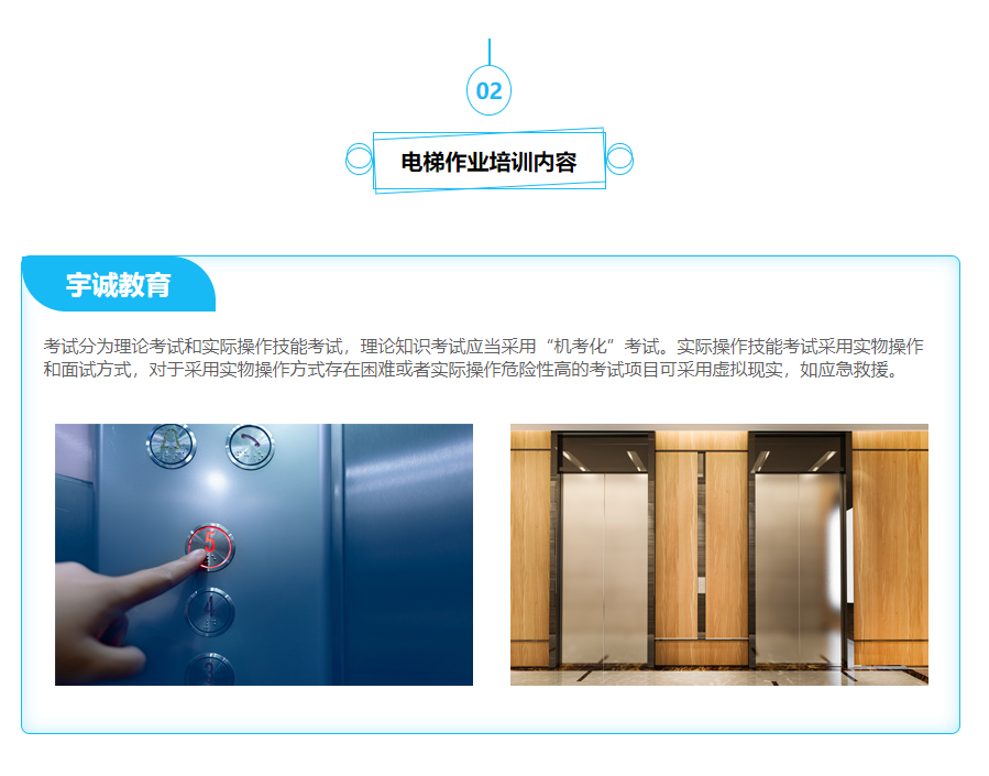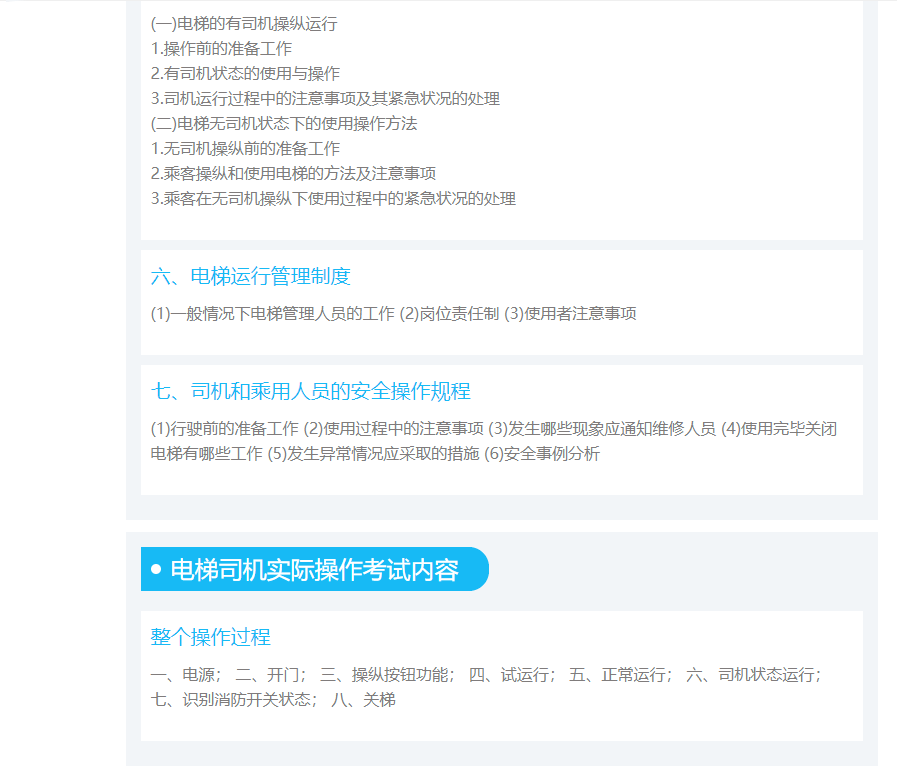 電梯質(zhì)量監(jiān)督和安全運(yùn)行管理、電梯的主驅(qū)動(dòng)和自動(dòng)控制系統(tǒng)、電梯的安全保護(hù)裝置、電梯的安裝、調(diào)試與試運(yùn)行、電梯的維修保養(yǎng)、電梯安全操作規(guī)程與常見故障的判別方法、自動(dòng)扶梯和自動(dòng)人行道等。應(yīng)當(dāng)按照國家有關(guān)規(guī)定經(jīng)特種設(shè)備安全監(jiān)督管理部門考核合格,取得國家統(tǒng)一格式的特種作業(yè)人員證書,方可從事相應(yīng)的作業(yè)或者管理工作。