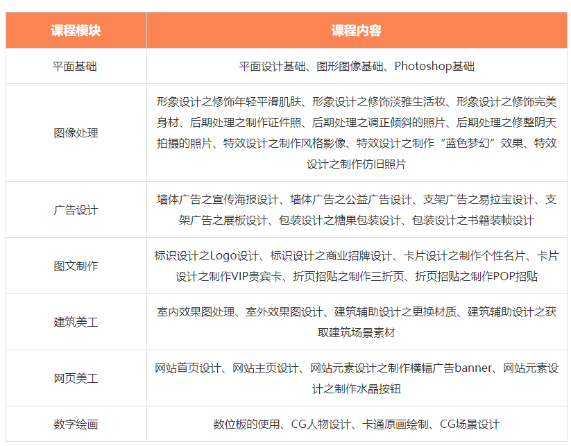 課程模塊課程內(nèi)容 平面基礎 平面設計基礎、圖形圖像基礎、Photoshop基礎 圖像處理 形象設計之修飾年輕平滑肌膚、形象設計之修飾淡雅生活妝、形象設計之修飾完美身材、后期處理之制作證件照、后期處理之調(diào)正傾斜的照片、后期處理之修整陰天拍攝的照片、特效設計之制作風格影像、特效設計之制作“藍色夢幻”效果、特效設計之制作仿舊照片 廣告設計 墻體廣告之宣傳海報設計、墻體廣告之公益廣告設計、支架廣告之易拉寶設計、支架廣告之展板設計、包裝設計之糖果包裝設計、包裝設計之書籍裝幀設計 圖文制作 標識設計之Logo設計、標識設計之商業(yè)招牌設計、卡片設計之制作個性名片、卡片設計之制作VIP貴賓卡、折頁招貼之制作三折頁、折頁招貼之制作POP招貼 建筑美工 室內(nèi)效果圖處理、室外效果圖設計、建筑輔助設計之更換材質(zhì)、建筑輔助設計之獲取建筑場景素材 網(wǎng)頁美工 網(wǎng)站首頁設計、網(wǎng)站主頁設計、網(wǎng)站元素設計之制作橫幅廣告banner、網(wǎng)站元素設計之制作水晶按鈕 數(shù)字繪畫 數(shù)位板的使用、CG人物設計、卡通原畫繪制、CG場景設計 【課程特色】: 1、按崗位需求設定項目,所有項目面向行業(yè),所有任務依據(jù)崗位展開知識的學習和任務的制作; 2、內(nèi)容設計采用基于工作過程形式,操作性強,非常適合高職學生的學習; 3、知識排列按照任務需求進行,盡量大項目小知識,“必需、夠用”,刪繁就簡,舍棄多而全的知識羅列,提高實用性。 4、每個任務都是按照行業(yè)標準完成,實現(xiàn)了內(nèi)容與企業(yè)崗位對接。 【課程目標】: 1、了解平面設計的基本知識;掌握平面構圖技巧;掌握平面設計的創(chuàng)意手法;掌握色彩構成及色彩模式;掌握圖形圖像基礎知識;熟悉PhotoshopCC工作窗口。能進行平面作品的構圖設計;能運用創(chuàng)意手法進行作品設計;能啟動和退出PhotoshopCC 2、掌握修飾工具的使用;掌握色彩及色調(diào)的調(diào)整;掌握濾鏡的使用。能對人物進行形象設計;能對照片進行后期處理;能對圖像進行后期特效制作 3、掌握圖層的基本知識;掌握選區(qū)的基本知識;掌握漸變的基本知識;掌握廣告、海報、展板、包裝的設計制作。能完成摳圖操作;能編輯圖層;能創(chuàng)建漸變效果;能制作和設計常見的廣告作品 4、了解常見卡片的制作流程和方法;了解常見折頁的制作方法和行業(yè)標準;掌握矢量繪圖工具的使用。能進行Logo的設計制作;能進行商業(yè)招牌的制作;能進行POP招貼的創(chuàng)意設計;能進行各種卡片的設計制作;能進行常見宣傳折頁的設計制作 課程目標 5、掌握鋼筆工具的使用;掌握路徑的相關操作;掌握蒙版的使用;掌握圖像的編輯。能對渲染圖進行基本分析和處理;能制作簡單的建筑室內(nèi)室外效果圖;能精確摳取建筑場景及更換建筑材質(zhì) 6、了解網(wǎng)頁設計的基本知識;掌握切片工具的使用;掌握標尺及輔助線的使用;掌握動畫的制作方法;掌握網(wǎng)頁中各種元素的制作方法;掌握網(wǎng)頁的布局。能制作出網(wǎng)頁的各種動態(tài)特效效果;能設計制作網(wǎng)頁界面中的各種元素;能設計制作網(wǎng)站的首頁和主頁;能將制作好的網(wǎng)頁存儲為網(wǎng)絡瀏覽格式。 7、掌握數(shù)位板的使用;掌握繪制線條的方法;掌握填色技巧;掌握畫筆工具的調(diào)節(jié);掌握鋼筆工具的用法。會結合數(shù)位板繪制線條;會進行線稿圖上色;會結合數(shù)位板進行人物、原畫及場景的設計與繪制 |
