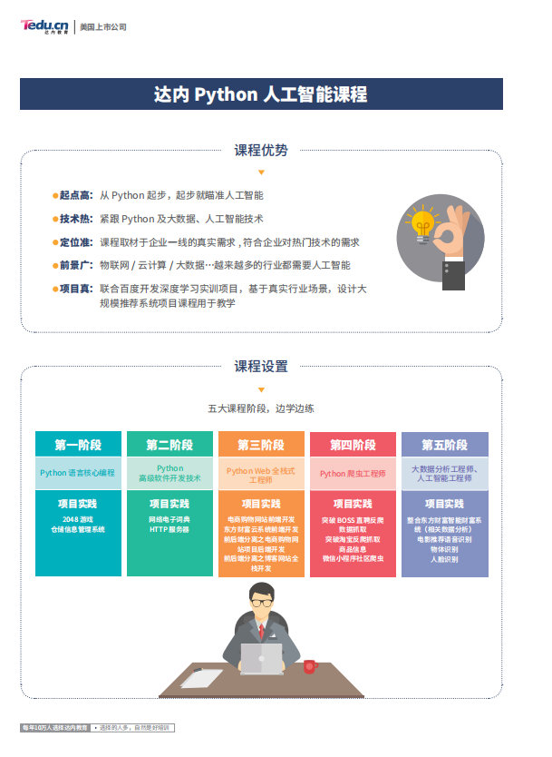 課程簡(jiǎn)介:達(dá)內(nèi)python人工智能課程始終以項(xiàng)目貫穿始終,讓同學(xué)們?cè)趯W(xué)習(xí)期間就能夠習(xí)得實(shí)戰(zhàn)項(xiàng)目經(jīng)驗(yàn),0基礎(chǔ)也能學(xué),就業(yè)時(shí)更容易獲得名企青睞。