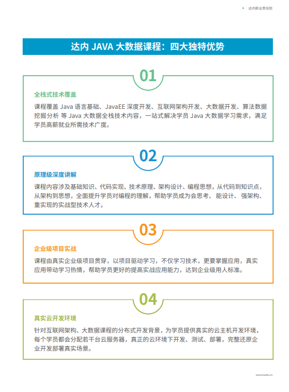 適合學(xué)員:在職提升,IT技術(shù)提升 使用教材:線下授課 課程簡(jiǎn)介:課程覆蓋java語(yǔ)言基礎(chǔ)、JavaEE深度開發(fā)、互聯(lián)網(wǎng)架構(gòu)開發(fā)、大數(shù)據(jù)開發(fā)、算法數(shù)據(jù)挖掘分析等Java大數(shù)據(jù)全棧技術(shù)內(nèi)容,一站式解決學(xué)員Java大數(shù)據(jù)學(xué)習(xí)需求,滿足學(xué)員高薪就業(yè)所需技術(shù)廣度。 課程特色: 1.全棧式技術(shù)覆蓋 2.原理級(jí)深度講解 3.企業(yè)級(jí)項(xiàng)目實(shí)戰(zhàn) 4.真實(shí)云開發(fā)環(huán)境
