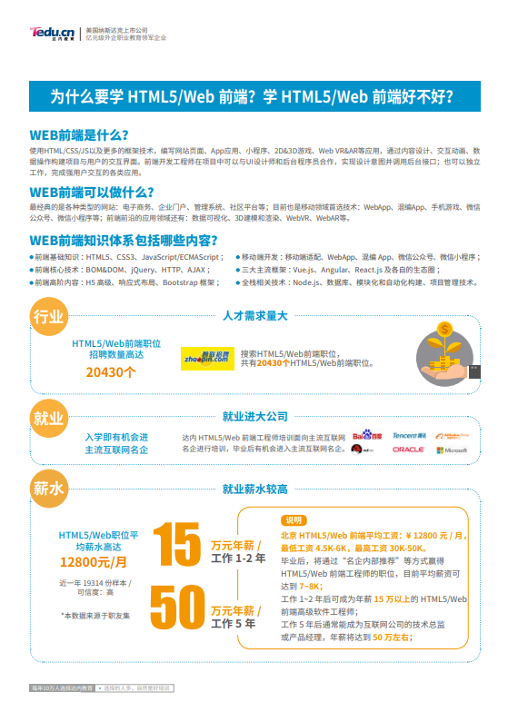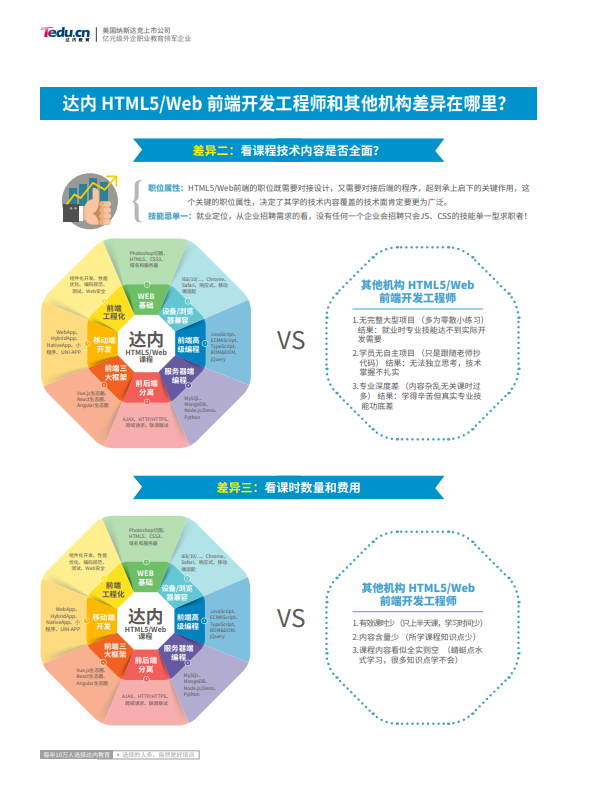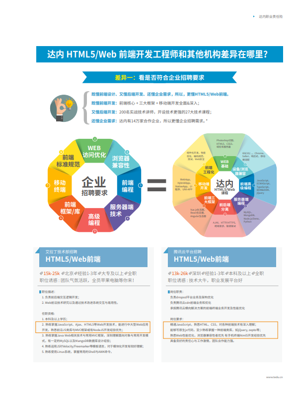 懂前端開發(fā):前端核心+三大框架+移動端開發(fā)全面&深入; 又懂后端開發(fā):200名實戰(zhàn)技術(shù)講師,開設(shè)技術(shù)更強的27大技術(shù)課程; 還懂企業(yè)需求:達(dá)內(nèi)有14萬家合作企業(yè),所以更懂企業(yè)招聘需求。 |