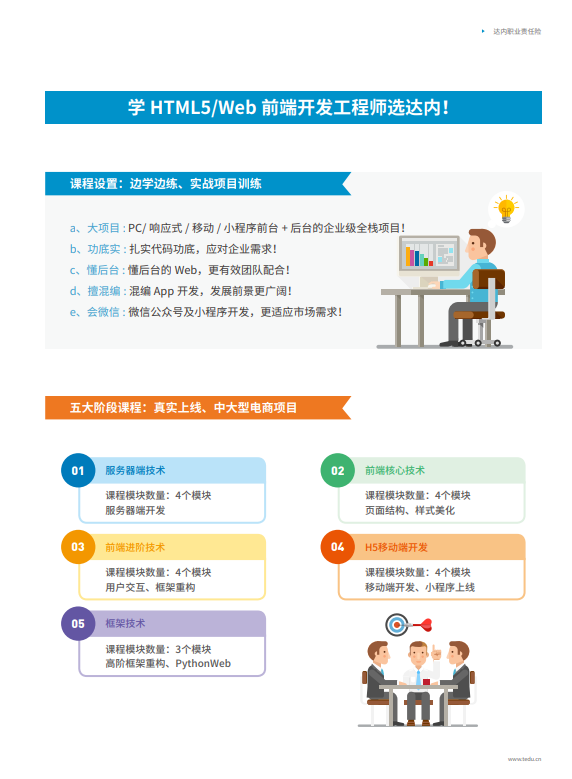 1.大項目:PC/響應(yīng)式/移動/小程序前臺+后臺的企業(yè)級全棧項目! 2.功底實:扎實代碼功底,應(yīng)對企業(yè)需求! 3.懂后臺:懂后臺的Web,更有效團(tuán)隊配合! 4.擅混編:混編App開發(fā),發(fā)展前景更廣闊! 5.會微信:微信公眾號及小程序開發(fā),更適應(yīng)市場需求! 6.免費重修 7.7天免費試學(xué) 8.簽署就業(yè)協(xié)議,符合條件可退還學(xué)費: