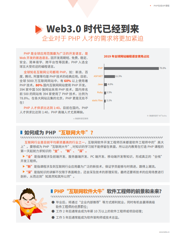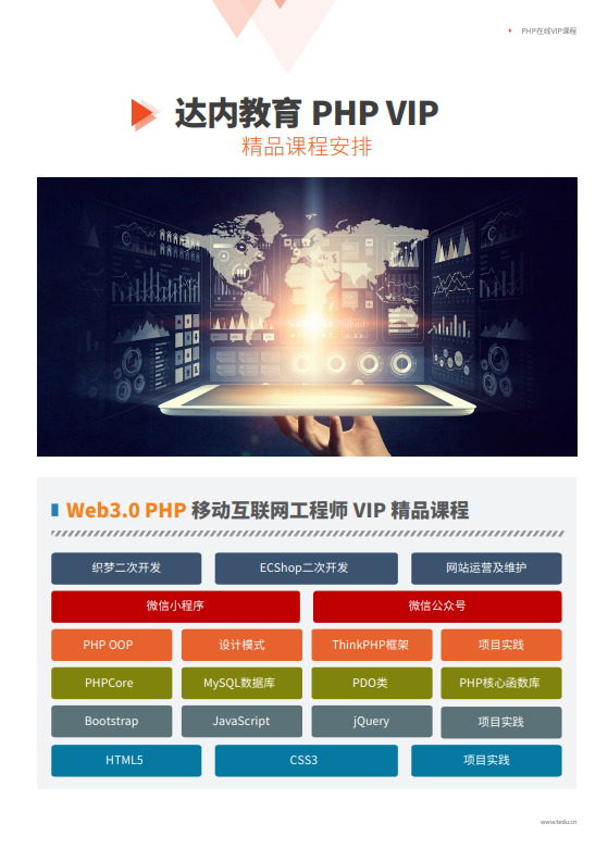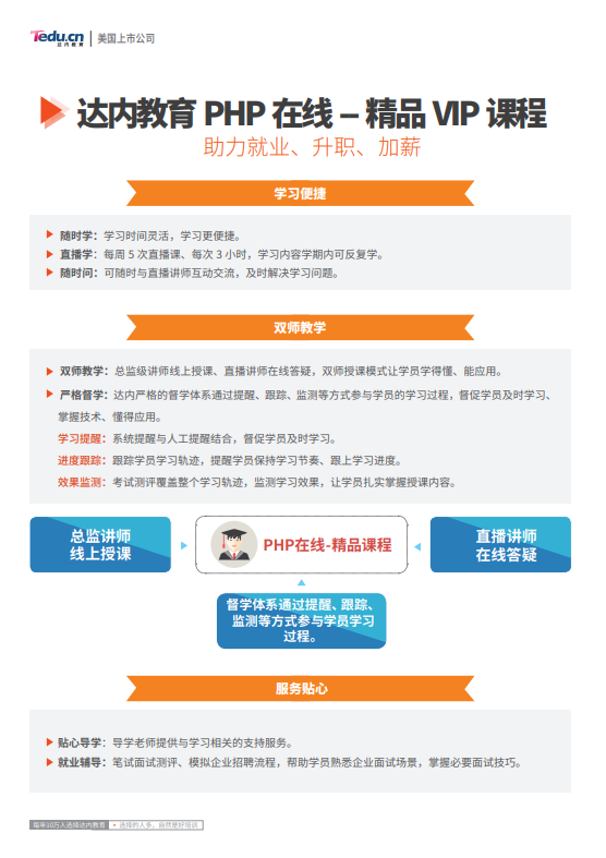 適合學(xué)員:技術(shù)進(jìn)階、應(yīng)屆畢業(yè)生、在職轉(zhuǎn)行 使用教材: 隨時學(xué):學(xué)習(xí)時間靈活,學(xué)習(xí)更便捷。 直播學(xué):每周5次直播課、每次3小時,學(xué)習(xí)內(nèi)容學(xué)期內(nèi)可反復(fù)學(xué)。 隨時問:可隨時與直播講師互動交流,及時解決學(xué)習(xí)問題。 課程簡介:課程內(nèi)容共劃分為6個階段,階段課程的設(shè)置遵循從原生到框架、從前端到服務(wù)器編程、從PC端到移動端、從自主開發(fā)到二次開發(fā)的理念,這樣可以更好的理解知 識的層次結(jié)構(gòu);并且每個階段均設(shè)有階段項(xiàng)目實(shí)踐,這樣充分保證能夠?qū)W員能得懂、會應(yīng)用。 課程特色: 1.內(nèi)功深:包含行業(yè)內(nèi)更深入的php課程,基礎(chǔ)課程時間長,內(nèi)容深入。 2.技術(shù)新:包含互聯(lián)網(wǎng)最實(shí)用、最流行的技術(shù)內(nèi)容(HTML5、CSS3、Bootstrap、ThinkPHP5等)?!裰v師優(yōu):上市企業(yè)高薪匯聚行業(yè)內(nèi)更牛的PHP講師,教學(xué)總監(jiān)領(lǐng)銜授課。 3.教法好:雙師直播線上授課,課堂效率不斷優(yōu)化,在有限的時間內(nèi)將更深更新的知識傳授給學(xué)員。 4.前景好:將通過“企業(yè)內(nèi)部推薦”等方式,為PHP“互聯(lián)網(wǎng)大牛”軟件工程師贏得優(yōu)質(zhì)職位。 5.免費(fèi)重修 6.7天免費(fèi)試學(xué) 7.簽署就業(yè)協(xié)議,符合條件可退還學(xué)費(fèi)