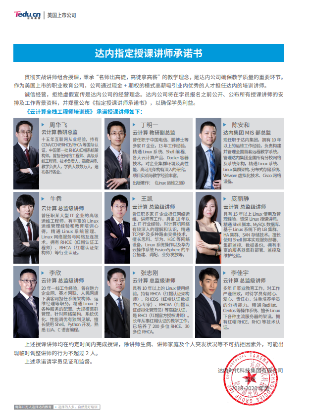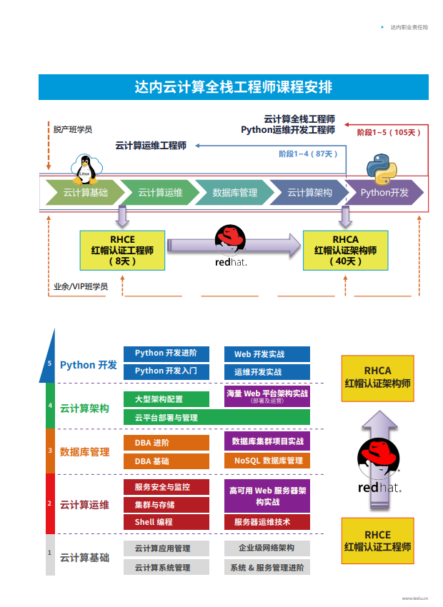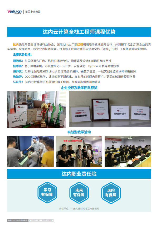 適合學(xué)員:在職提升,IT技術(shù)提升,編程0基礎(chǔ) 使用教材:線下授課 課程簡介: 達(dá)內(nèi)經(jīng)過十七年的探索和改良,結(jié)合目前炙手可熱的云計算、python開發(fā)等熱點技術(shù),以企業(yè)實際應(yīng)用需求為導(dǎo)向,開創(chuàng)性的將Linux云計算和Python開發(fā)技術(shù)緊密結(jié)合在一起,研發(fā)出一套全新的云計算全棧工程師高端課程。主要培養(yǎng)在云計算網(wǎng)絡(luò)、云計算運維、虛擬化技術(shù)、Docker容器、集群與存儲、數(shù)據(jù)庫管理、安全技術(shù)、自動化運維、互聯(lián)網(wǎng)架構(gòu)、Hadoop大數(shù)據(jù)運維、Python開發(fā)等方面具備扎實理論基礎(chǔ)和過硬實踐能力的復(fù)合型人才,以解決目前企業(yè)招聘難、學(xué)員就業(yè)難、高端云計算崗位稀缺等問題。 課程特色: 1.國際化:與國際著名廠商、機(jī)構(gòu)的戰(zhàn)略合作,確保課程設(shè)計的前瞻性和實用性 2.技術(shù)高:基于集群架構(gòu),涉及虛擬化、云計算、安全攻防、Python開發(fā)等高端技術(shù) 3.講師優(yōu):匯聚行業(yè)內(nèi)資深的Linux/云計算技術(shù)講師,由教學(xué)總監(jiān)、一線實戰(zhàn)總監(jiān)級講師領(lǐng)銜授課 4.教法好:O2O雙模式教學(xué),課堂效率不斷優(yōu)化,在有限的時間內(nèi)將更廣、更深的知識傳授給學(xué)員 5.認(rèn)證牛:達(dá)內(nèi)云計算學(xué)員可獲得紅帽工程師、紅帽架構(gòu)師等國際認(rèn)證