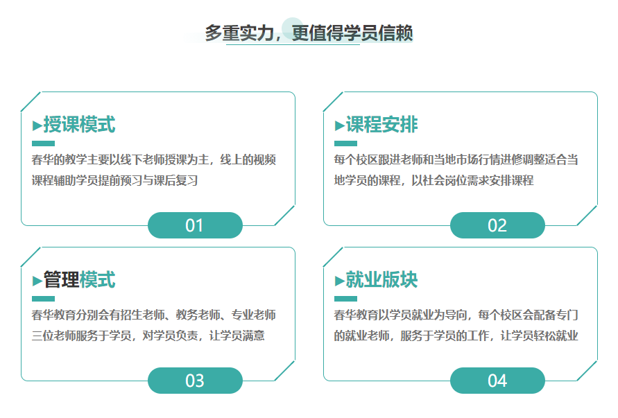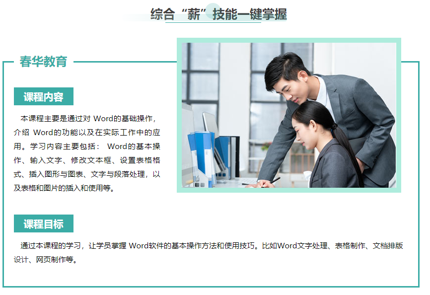 辦公自動化技術(shù)在企業(yè)中的應(yīng)用越來越廣泛,很多企業(yè)都要求員工能熟練使用計算機(jī)來處理一些簡單的日常辦公事務(wù),但是現(xiàn)在很多人由于電腦操作能力差,導(dǎo)致工作效率很低。因此,如果想要在短時間內(nèi)掌握辦公電腦技能就必須學(xué)習(xí)電腦培訓(xùn)課程。春華教育針對不同基礎(chǔ)的學(xué)員開設(shè)了各類電腦辦公課程,下面我們來了解一下Word辦公軟件培訓(xùn)課程吧! |