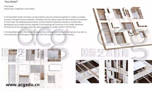 He同學(xué):作品集中的一個項目是在康奈爾大學(xué)上夏校的時候花六周做出來的。這個項目包括數(shù)十個不同類型的材質(zhì)的模型以及繪圖作品。從第一周開始抽到的功能詞“intersection”開始進行創(chuàng)作,用模型和繪圖對這個詞匯進行深入的解讀和再創(chuàng)造。我的創(chuàng)作理念是從 intersection開始對其進行多重意義的解讀,并嘗試將這個詞語不同的意義轉(zhuǎn)化成作品的元素,并將其融合在一起,借此來探索空間與體量。