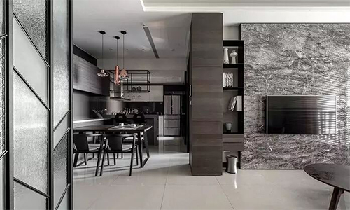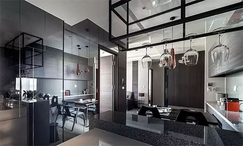 玻璃,鐵件,具鏡像反射效果的灰鏡,及凸顯豪宅質(zhì)感的灰鋼石,展現(xiàn)出現(xiàn)代風(fēng)格冷冽的特質(zhì),設(shè)計(jì)師還巧妙利用鋼刷木皮與壁紙,為空間注入溫馨氛圍,達(dá)到微妙的平衡。