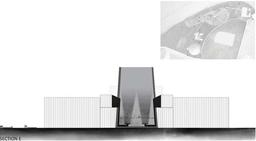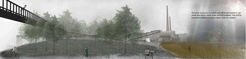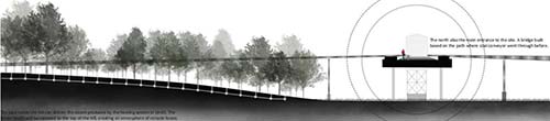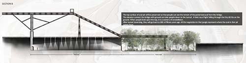 煤坑的頂面將被保留下來,人們可以從橋上看到煤粉的剩余部分。電梯將大橋與地面連接起來,可以將人們帶到隧道內(nèi)。從微小的狹縫中落下的微弱的光線掠過地面。當(dāng)人們看到頂部時,這是一系列風(fēng)景。隧道穿越后,將回到300萬億年前,那個叢林里的所有植物都代表那個坑里的煤來自哪里。