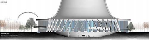在原有的冷卻塔施工的基礎(chǔ)上,建立了一個凹陷的表演空間和一個環(huán)繞的走廊。 這個設(shè)計正試圖讓人們有一個清爽的體驗,在冷卻塔里享受這個節(jié)目(可能是一場音樂會或其他行為藝術(shù))。 高架走廊進出水幕,界面會有一些樂趣?;旌现渌穆曇?,這將是一個難忘的音樂會。